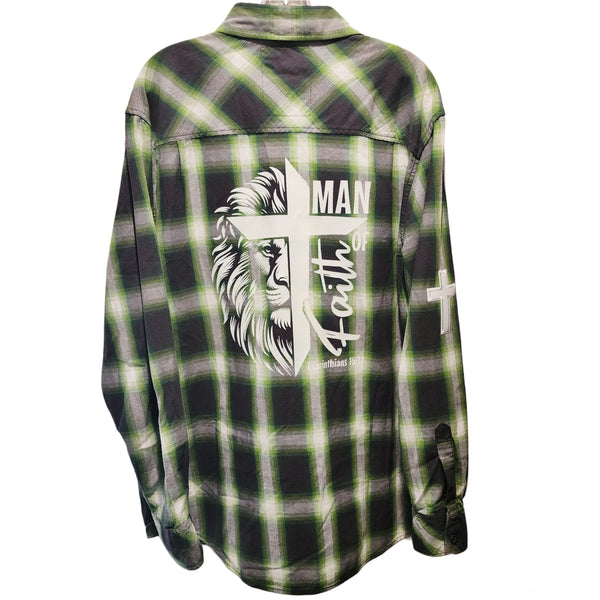 This repurposed shirt features a green, white, and dark gray color palette, offering a classic and versatile look. Crafted with attention to detail, this one-of-a-kind handcrafted "Man of Faith Lion of Judah" plaid shirt provides a comfortable and oh so stylish way to showcase your faith in Jesus Christ.