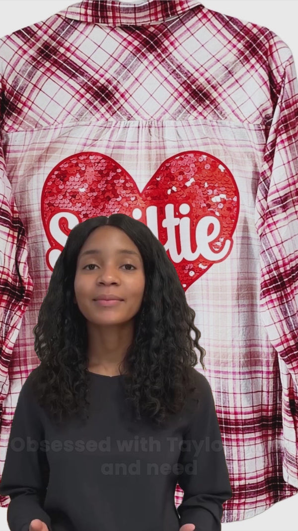 This plaid shirt has been upcycled into a statement piece to showcase your support and love for Taylor Swift.